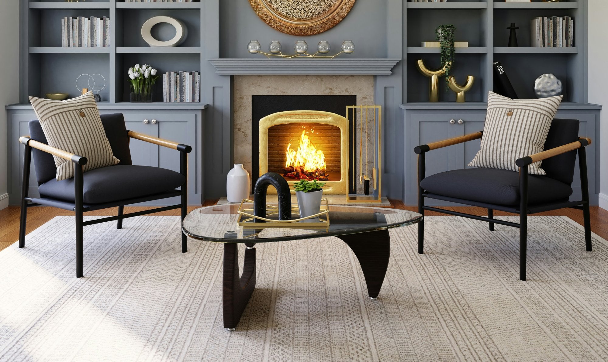 2. For a grounded, unified look, place a large rug that accommodates all your furniture—sofas, chairs, and coffee tables—on top of the rug. This creates a well-defined seating area and a more comfortable, inviting room.