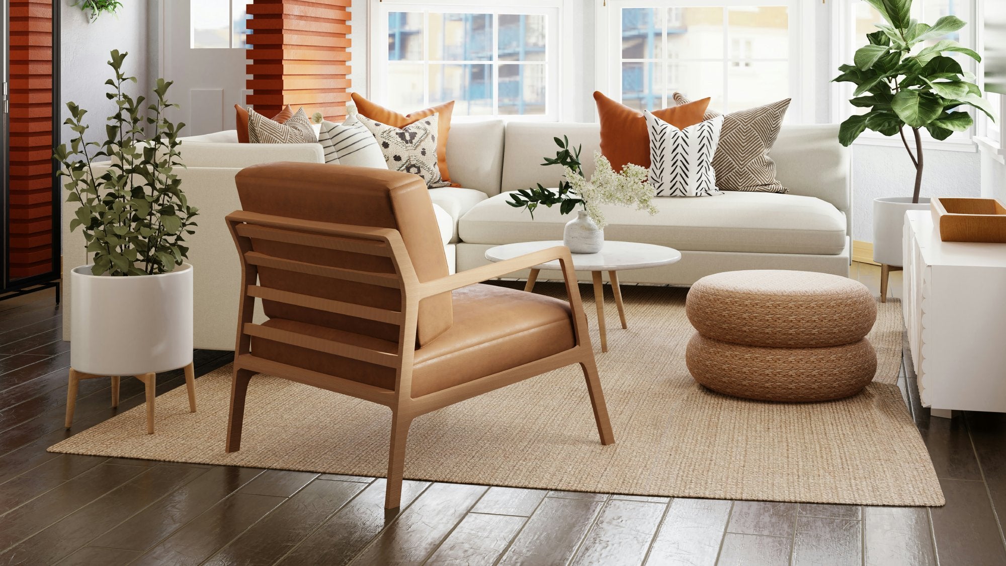 2. If you have a large rug, place it under your furniture so that all pieces, including the sofa and chairs, rest on the rug. This creates a grounded, cohesive seating area.